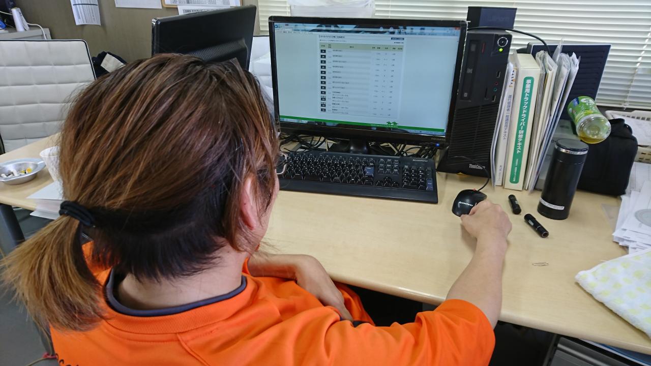 労務・運行管理者三井君!事務所で真面目にパソコンに夢中!いつもありがとう。最近長髪が似合う‼️
