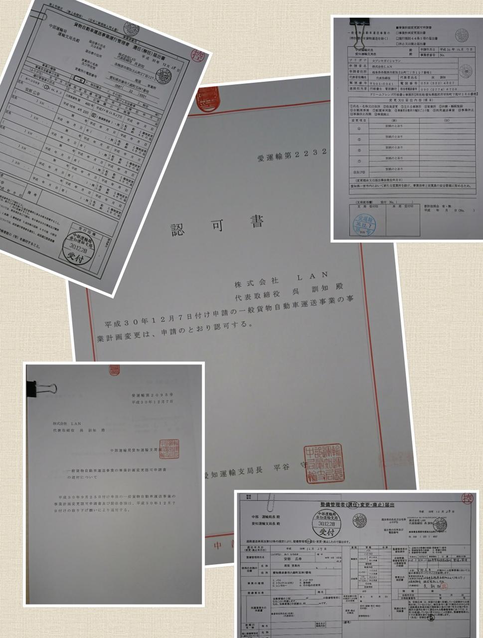 LAN尾張営業所「認可書」に伴う運行管理者選任「統括運行管理者 安部広幸」兼任、
